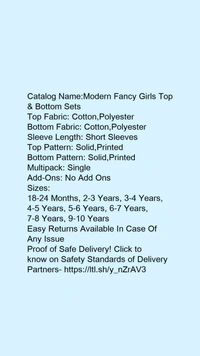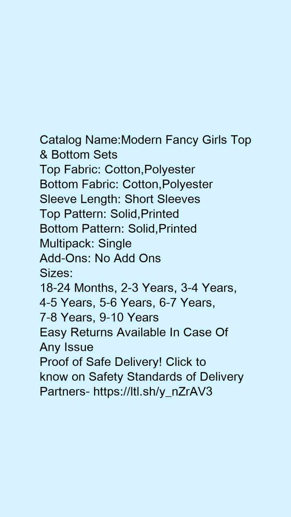 Catalog Name:*Modern Fancy Girls Top & Bottom Sets*Top Fabric: Cotton,PolyesterBottom Fabric: Cotton,PolyesterSleeve Length: Short SleevesTop Pattern: Solid,PrintedBottom Pattern: Solid,PrintedMultipack: SingleAdd-Ons: No Add Ons