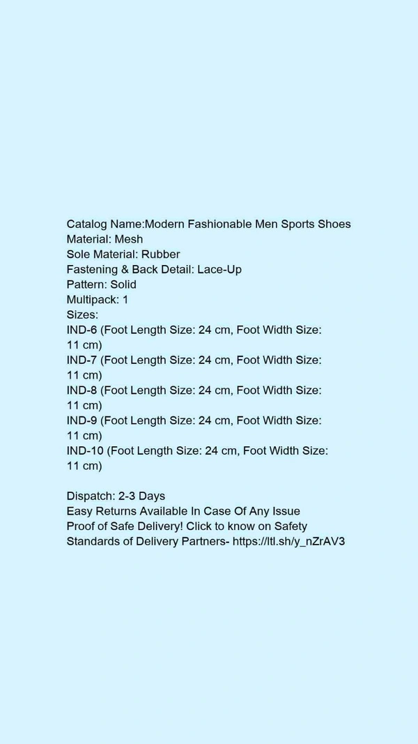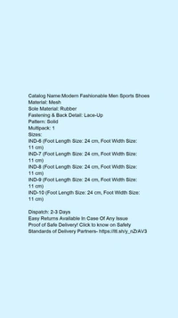Catalog Name:*Modern Fashionable Men Sports Shoes*Material: MeshSole Material: RubberFastening & Back Detail: Lace-UpPattern: SolidMultipack: 1