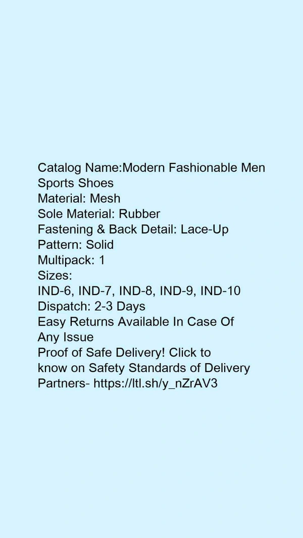 Catalog Name:*Modern Fashionable Men Sports Shoes*Material: MeshSole Material: RubberFastening & Back Detail: Lace-UpPattern: SolidMultipack: 1