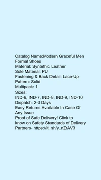 Catalog Name:*Modern Graceful Men Formal Shoes*Material: Syntethic LeatherSole Material: PUFastening & Back Detail: Lace-UpPattern: SolidMultipack: 1