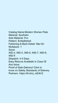 Catalog Name:*Modern Women Flats*Material: SyntheticSole Material: PvcPattern: EmbellishedFastening & Back Detail: Slip-OnMultipack: 1