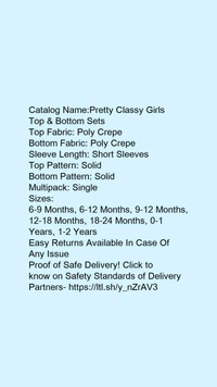 Catalog Name:*Pretty Classy Girls Top & Bottom Sets*Top Fabric: Poly CrepeBottom Fabric: Poly CrepeSleeve Length: Short SleevesTop Pattern: SolidBottom Pattern: SolidMultipack: Single