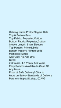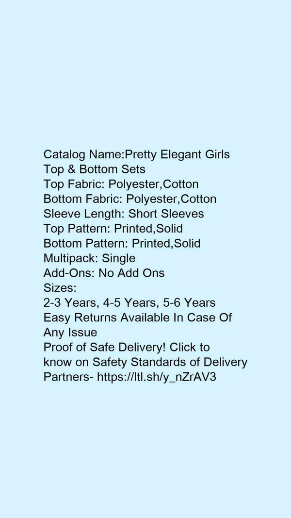 Catalog Name:*Pretty Elegant Girls Top & Bottom Sets*Top Fabric: Polyester,CottonBottom Fabric: Polyester,CottonSleeve Length: Short SleevesTop Pattern: Printed,SolidBottom Pattern: Printed,SolidMultipack: SingleAdd-Ons: No Add Ons