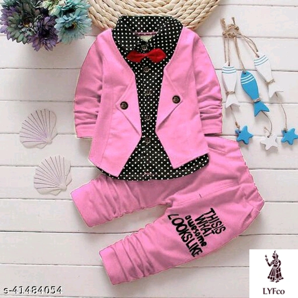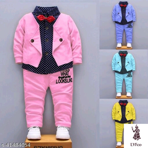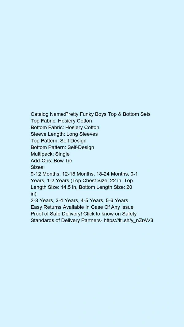 Catalog Name:*Pretty Funky Boys Top & Bottom Sets*Top Fabric: Hosiery CottonBottom Fabric: Hosiery CottonSleeve Length: Long SleevesTop Pattern: Self DesignBottom Pattern: Self-DesignMultipack: SingleAdd-Ons: Bow Tie