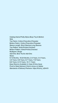 Catalog Name:*Pretty Stylus Boys Top & Bottom Sets*Top Fabric: Cotton,Polycotton,PolyesterBottom Fabric: Cotton,Polycotton,PolyesterSleeve Length: Short Sleeves,Long SleevesTop Pattern: Solid,Printed,CheckedBottom Pattern: Solid,Printed,CheckedMultipack: SingleAdd-Ons: Bow Tie,No Add Ons