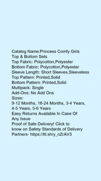 Catalog Name:*Princess Comfy Girls Top & Bottom Sets*Top Fabric: Polycotton,PolyesterBottom Fabric: Polycotton,PolyesterSleeve Length: Short Sleeves,SleevelessTop Pattern: Printed,SolidBottom Pattern: Printed,SolidMultipack: SingleAdd-Ons: No Add Ons