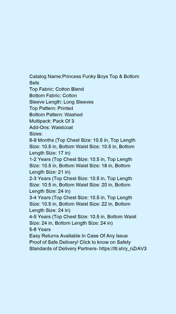 Catalog Name:*Princess Funky Boys Top & Bottom Sets*Top Fabric: Cotton BlendBottom Fabric: CottonSleeve Length: Long SleevesTop Pattern: PrintedBottom Pattern: WashedMultipack: Pack Of 3Add-Ons: Waistcoat
