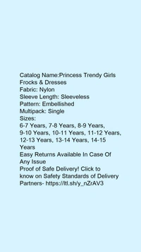 Catalog Name:*Princess Trendy Girls Frocks & Dresses*Fabric: NylonSleeve Length: SleevelessPattern: EmbellishedMultipack: Single