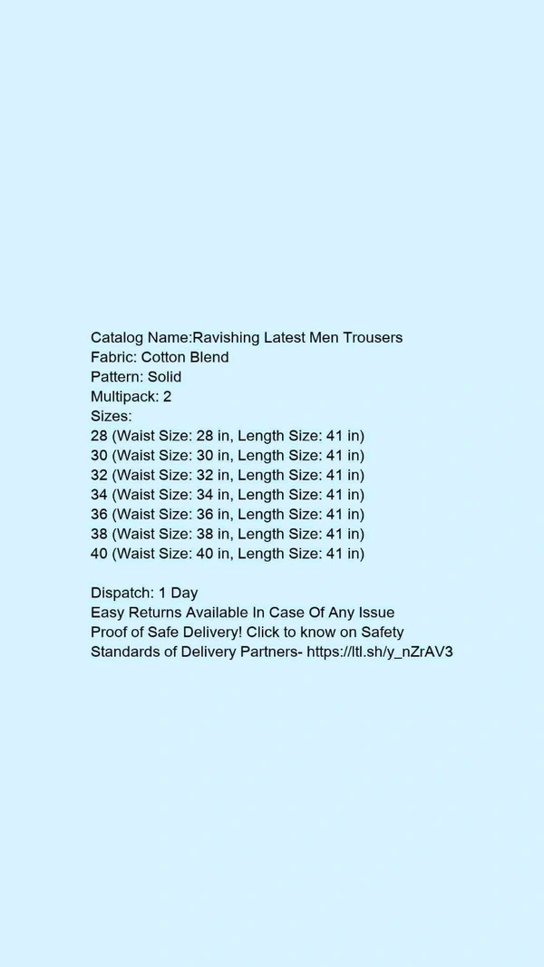 Catalog Name:*Ravishing Latest Men Trousers*Fabric: Cotton BlendPattern: SolidMultipack: 2
