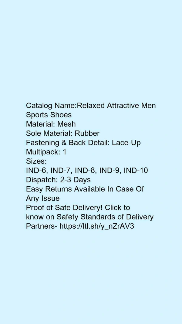 Catalog Name:*Relaxed Attractive Men Sports Shoes*Material: MeshSole Material: RubberFastening & Back Detail: Lace-UpMultipack: 1