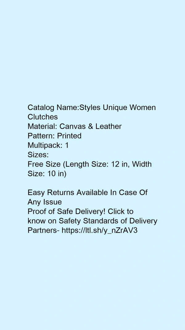 Catalog Name:*Styles Unique Women Clutches*Material: Canvas & LeatherPattern: PrintedMultipack: 1