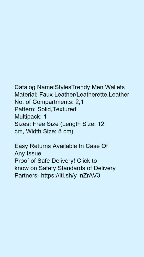 Catalog Name:*StylesTrendy Men Wallets*Material: Faux Leather/Leatherette,LeatherNo. of Compartments: 2,1Pattern: Solid,TexturedMultipack: 1