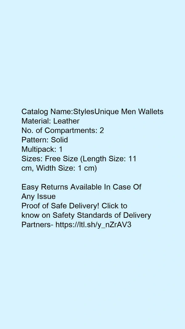 Catalog Name:*StylesUnique Men Wallets*Material: LeatherNo. of Compartments: 2Pattern: SolidMultipack: 1