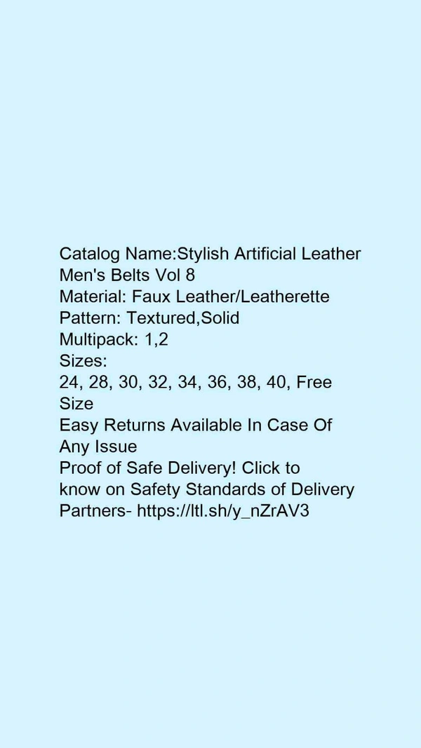 Catalog Name:*Stylish Artificial Leather Men's Belts Vol 8*Material: Faux Leather/LeatherettePattern: Textured,SolidMultipack: 1,2