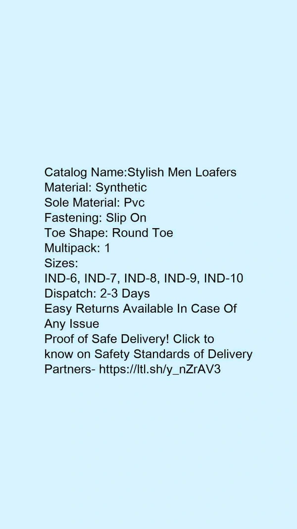 Catalog Name:*Stylish Men Loafers*Material: SyntheticSole Material: PvcFastening: Slip OnToe Shape: Round ToeMultipack: 1