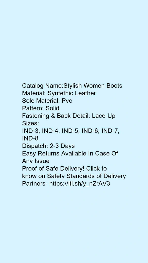 Catalog Name:*Stylish Women Boots*Material: Syntethic LeatherSole Material: PvcPattern: SolidFastening & Back Detail: Lace-Up