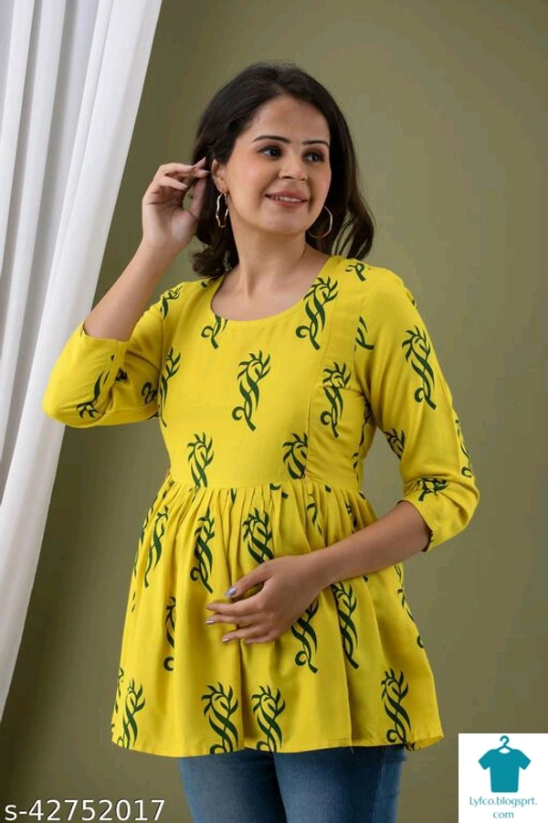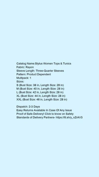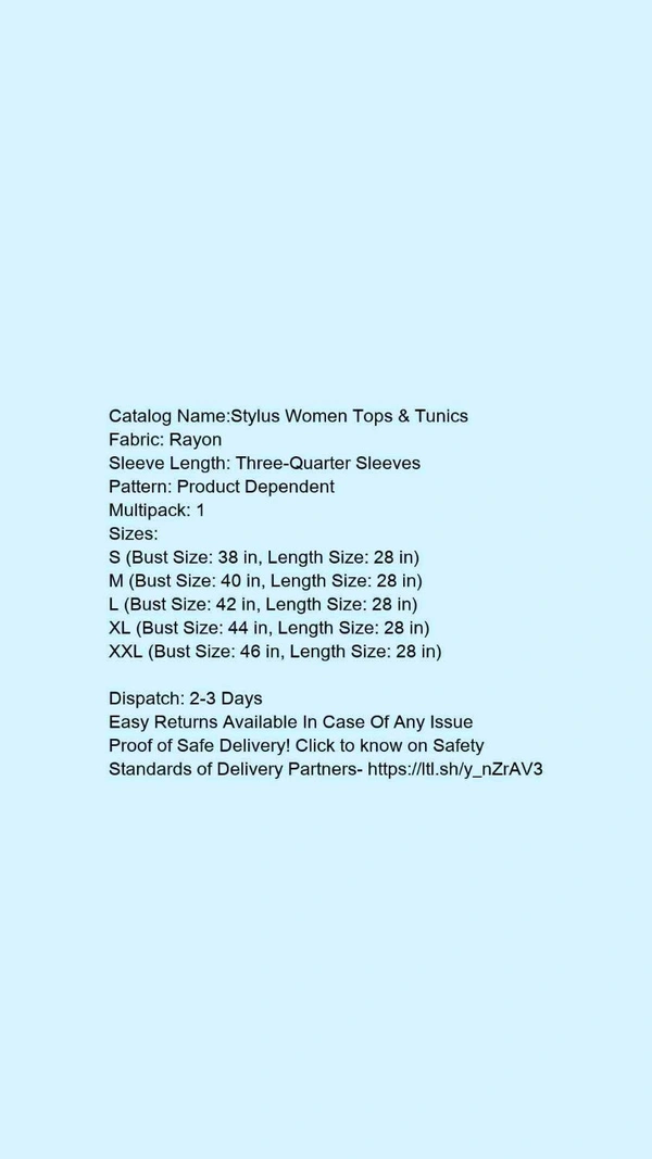 Catalog Name:*Stylus Women Tops & Tunics*Fabric: RayonSleeve Length: Three-Quarter SleevesPattern: Product DependentMultipack: 1