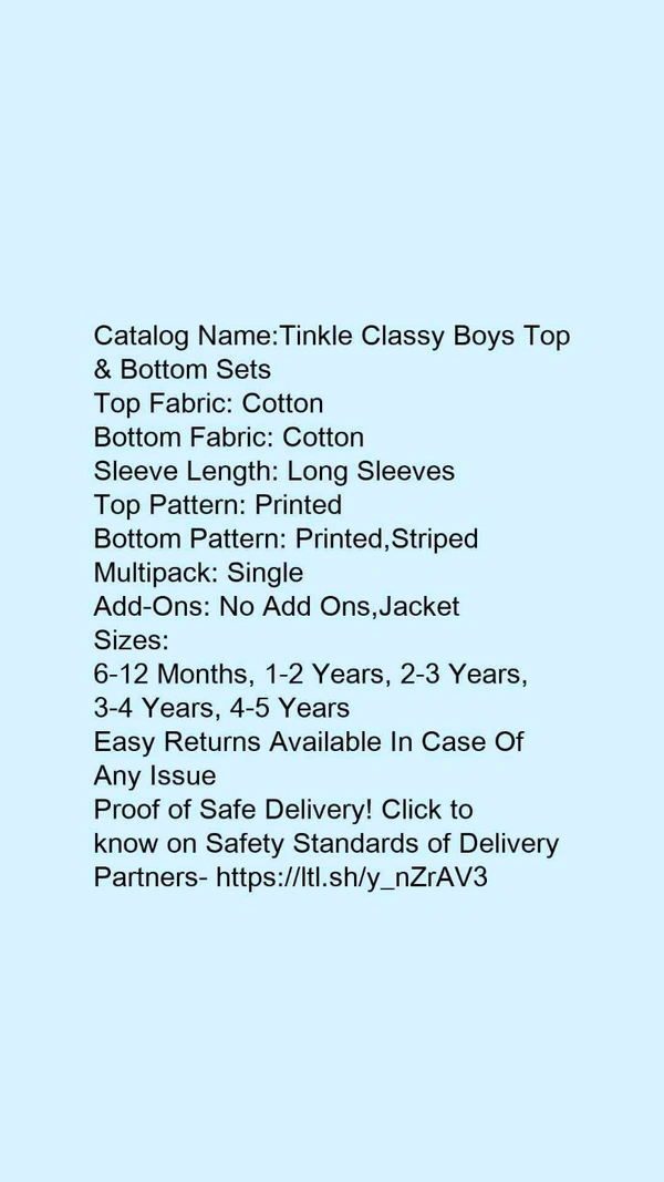 Catalog Name:*Tinkle Classy Boys Top & Bottom Sets*Top Fabric: CottonBottom Fabric: CottonSleeve Length: Long SleevesTop Pattern: PrintedBottom Pattern: Printed,StripedMultipack: SingleAdd-Ons: No Add Ons,Jacket