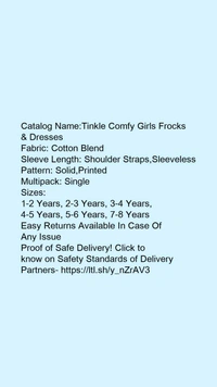 Catalog Name:*Tinkle Comfy Girls Frocks & Dresses*Fabric: Cotton BlendSleeve Length: Shoulder Straps,SleevelessPattern: Solid,PrintedMultipack: Single