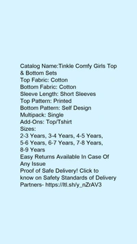 Catalog Name:*Tinkle Comfy Girls Top & Bottom Sets*Top Fabric: CottonBottom Fabric: CottonSleeve Length: Short SleevesTop Pattern: PrintedBottom Pattern: Self DesignMultipack: SingleAdd-Ons: Top/Tshirt