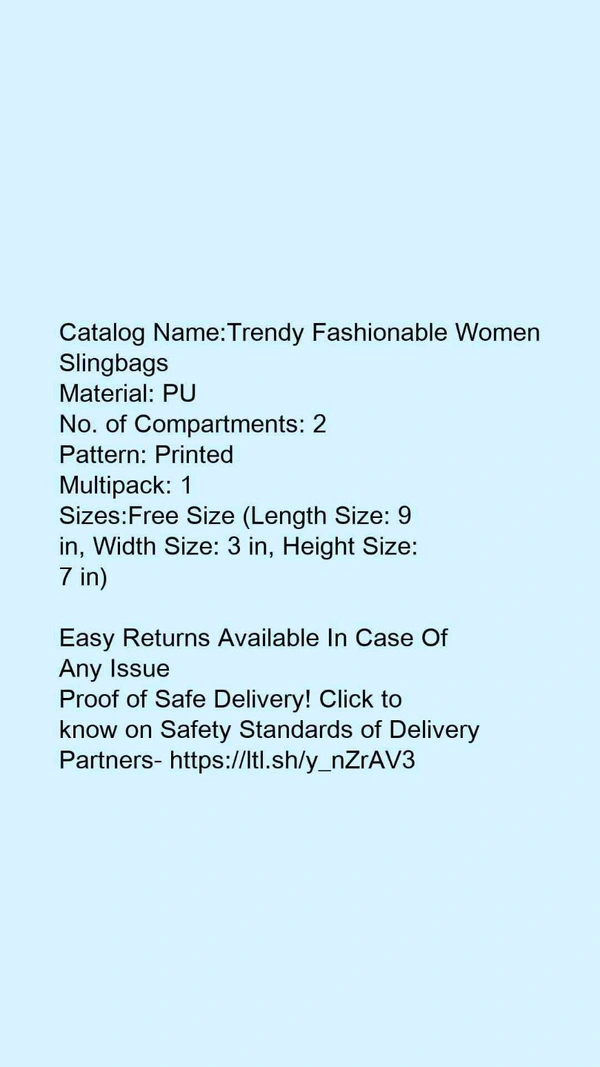 Catalog Name:*Trendy Fashionable Women Slingbags*Material: PUNo. of Compartments: 2Pattern: PrintedMultipack: 1