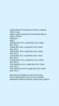 Catalog Name:*Trendy Modern Women Jumpsuits*Fabric: CrepeSleeve Length: Sleeveless,Three-Quarter SleevesPattern: PrintedMultipack: 1
