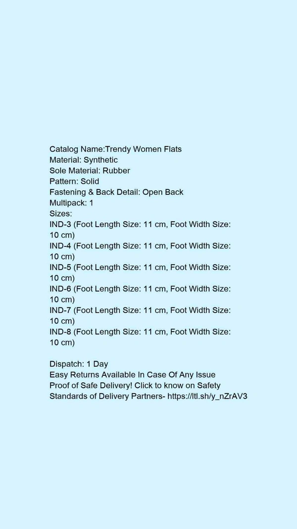 Catalog Name:*Trendy Women Flats*Material: SyntheticSole Material: RubberPattern: SolidFastening & Back Detail: Open BackMultipack: 1