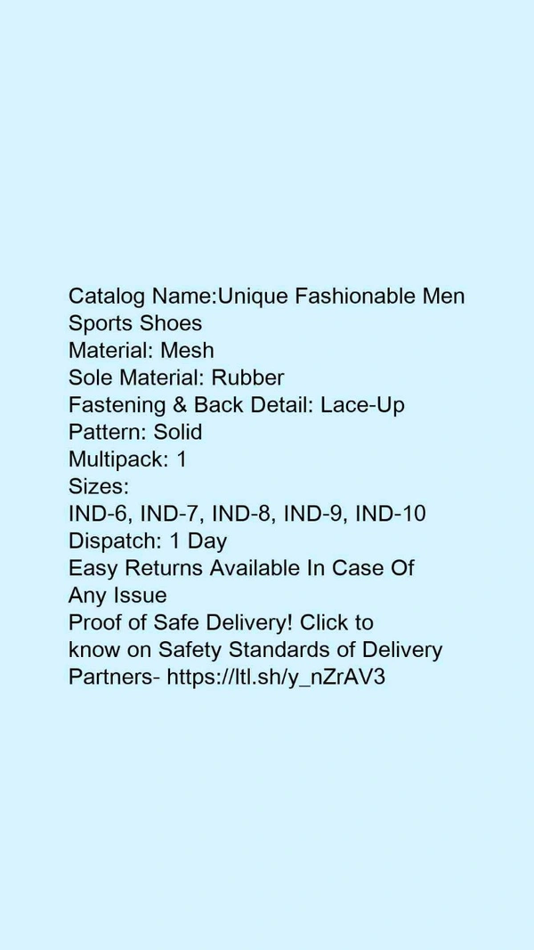 Catalog Name:*Unique Fashionable Men Sports Shoes*Material: MeshSole Material: RubberFastening & Back Detail: Lace-UpPattern: SolidMultipack: 1