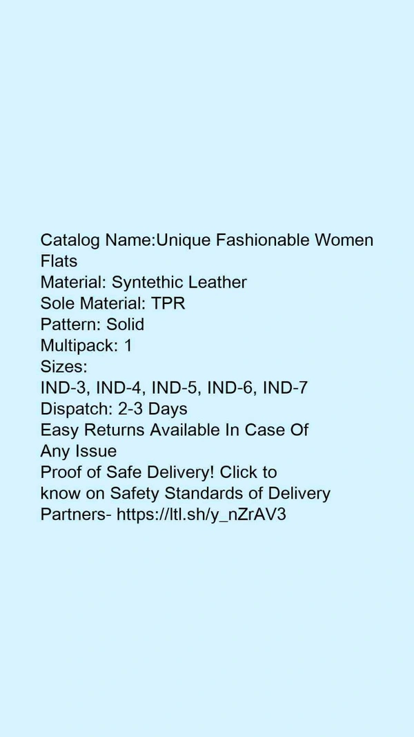 Catalog Name:*Unique Fashionable Women Flats*Material: Syntethic LeatherSole Material: TPRPattern: SolidMultipack: 1