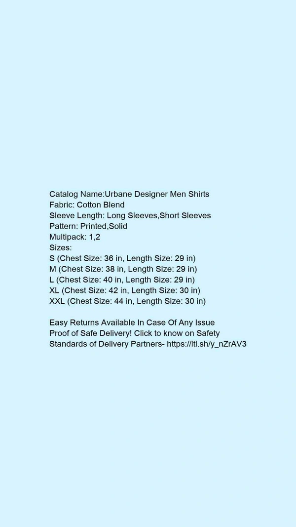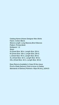 Catalog Name:*Urbane Designer Men Shirts*Fabric: Cotton BlendSleeve Length: Long Sleeves,Short SleevesPattern: Printed,SolidMultipack: 1