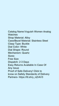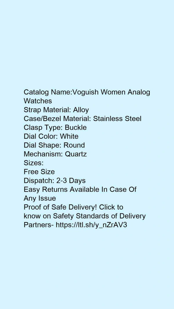 Catalog Name:*Voguish Women Analog Watches* Strap Material: Alloy Case/Bezel Material: Stainless Steel Clasp Type: Buckle Dial Color: White Dial Shape: Round Mechanism: Quartz