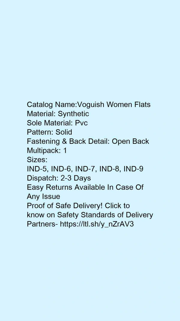 Catalog Name:*Voguish Women Flats*Material: SyntheticSole Material: PvcPattern: SolidFastening & Back Detail: Open BackMultipack: 1
