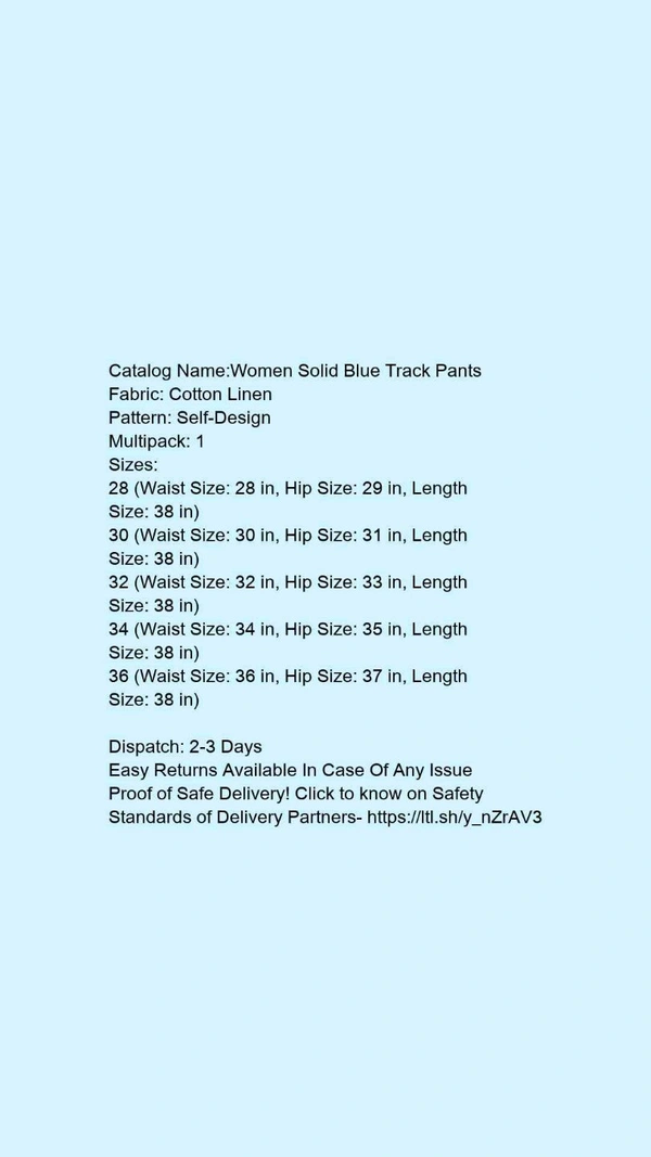 Catalog Name:*Women Solid Blue Track Pants*Fabric: Cotton LinenPattern: Self-DesignMultipack: 1