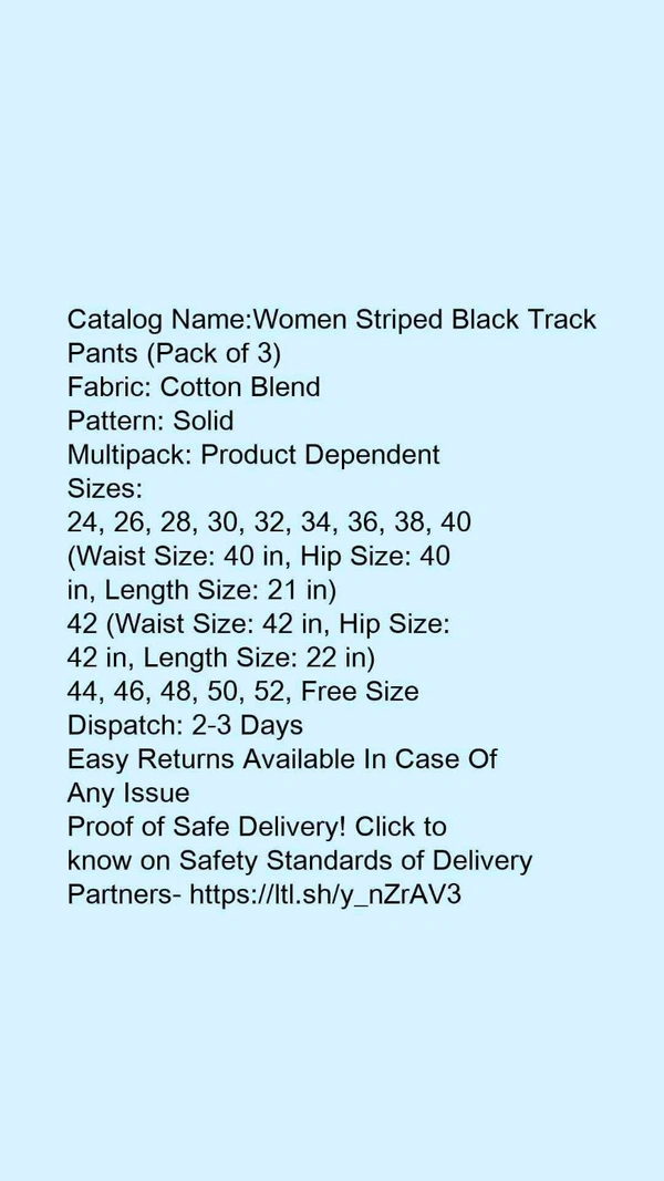 Catalog Name:*Women Striped Black Track Pants (Pack of 3)*Fabric: Cotton BlendPattern: SolidMultipack: Product Dependent