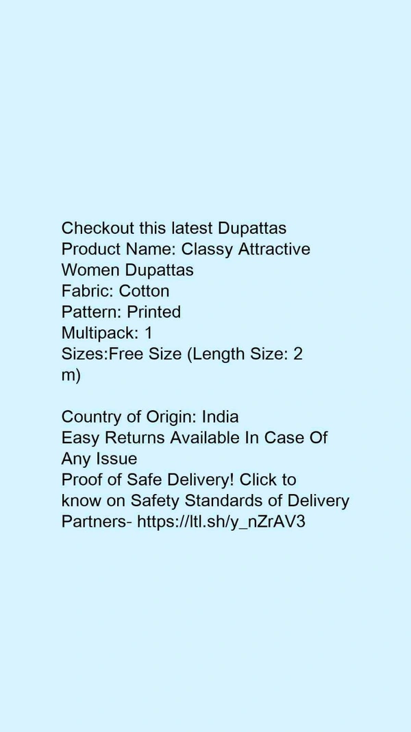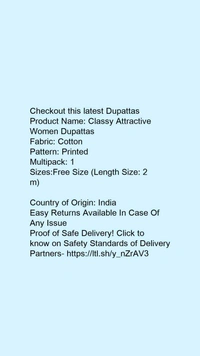 Checkout this latest DupattasProduct Name: *Classy Attractive Women Dupattas*Fabric: CottonPattern: PrintedMultipack: 1Sizes:Free Size (Length Size: 2 m) Country of Origin: India