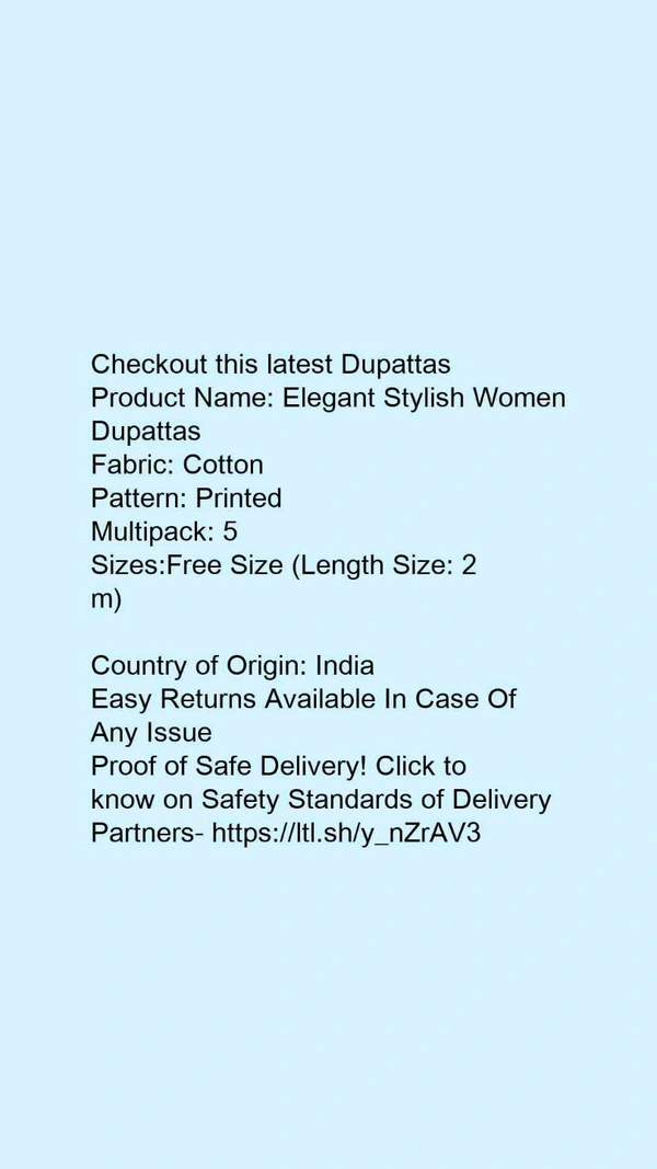 Checkout this latest DupattasProduct Name: *Elegant Stylish Women Dupattas*Fabric: CottonPattern: PrintedMultipack: 5Sizes:Free Size (Length Size: 2 m) Country of Origin: India