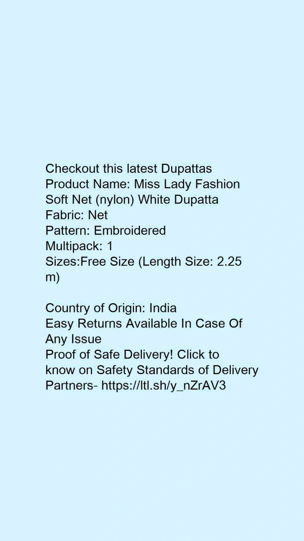 Checkout this latest DupattasProduct Name: *Miss Lady Fashion Soft Net (nylon) White Dupatta*Fabric: NetPattern: EmbroideredMultipack: 1Sizes:Free Size (Length Size: 2.25 m) Country of Origin: India
