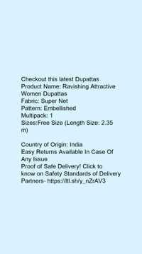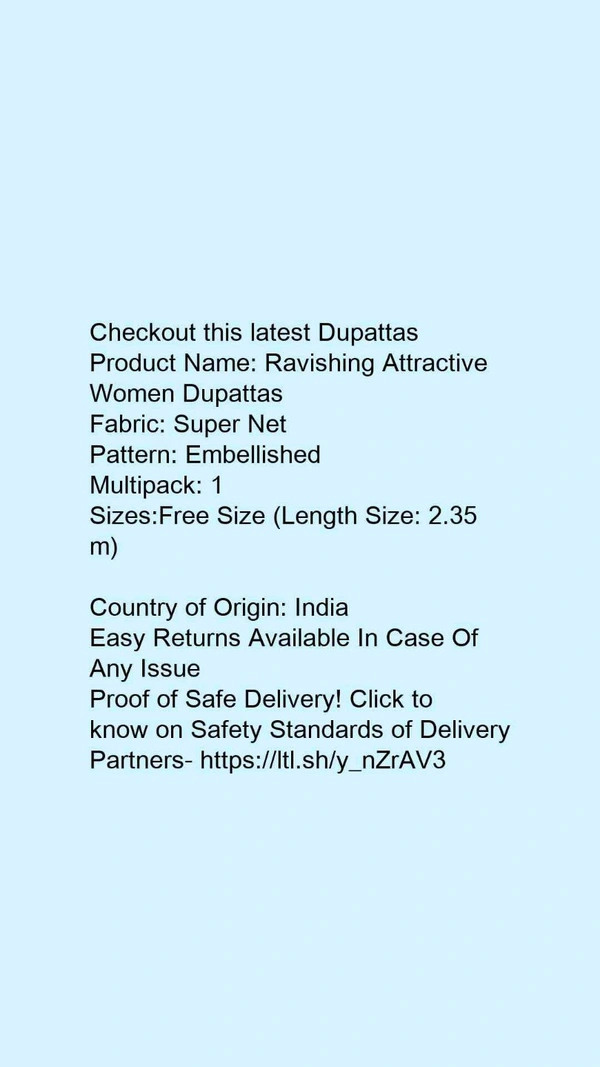 Checkout this latest DupattasProduct Name: *Ravishing Attractive Women Dupattas*Fabric: Super NetPattern: EmbellishedMultipack: 1Sizes:Free Size (Length Size: 2.35 m) Country of Origin: India