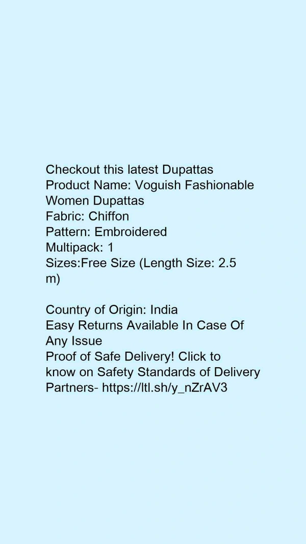 Checkout this latest DupattasProduct Name: *Voguish Fashionable Women Dupattas*Fabric: ChiffonPattern: EmbroideredMultipack: 1Sizes:Free Size (Length Size: 2.5 m) Country of Origin: India