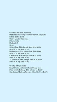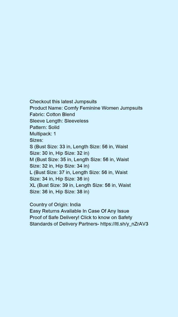 Checkout this latest JumpsuitsProduct Name: *Comfy Feminine Women Jumpsuits*Fabric: Cotton BlendSleeve Length: SleevelessPattern: SolidMultipack: 1