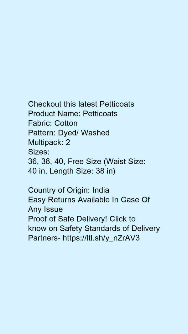 Checkout this latest PetticoatsProduct Name: *Petticoats*Fabric: CottonPattern: Dyed/ WashedMultipack: 2Sizes: 36, 38, 40, Free Size (Waist Size: 40 in, Length Size: 38 in) Country of Origin: India