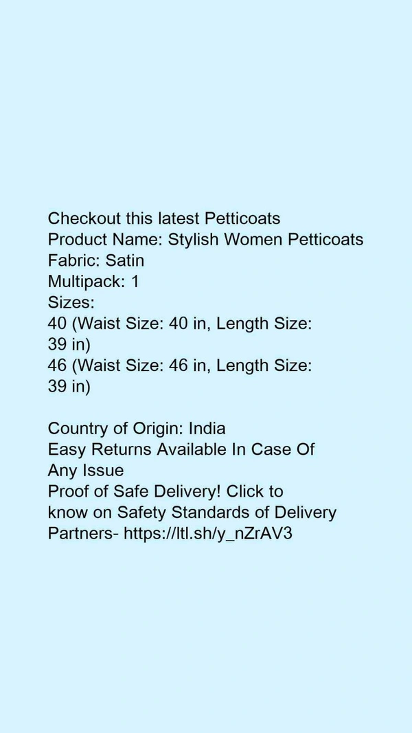 Checkout this latest PetticoatsProduct Name: *Stylish Women Petticoats*Fabric: SatinMultipack: 1Sizes: 40 (Waist Size: 40 in, Length Size: 39 in) 46 (Waist Size: 46 in, Length Size: 39 in) Country of Origin: India