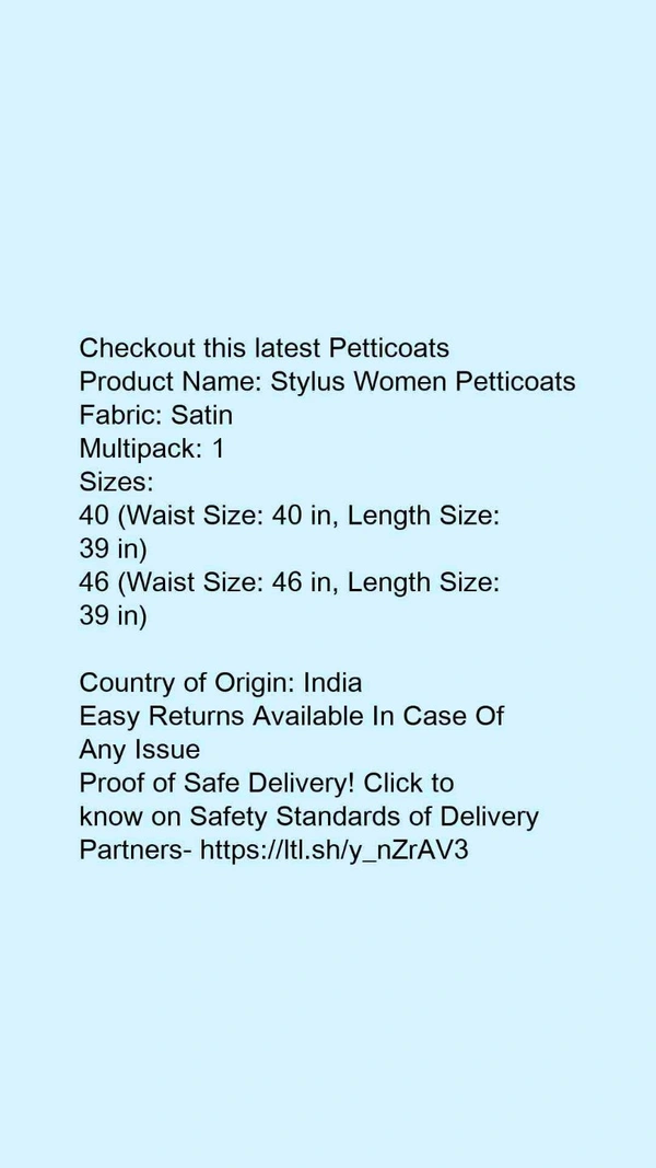 Checkout this latest PetticoatsProduct Name: *Stylus Women Petticoats*Fabric: SatinMultipack: 1Sizes: 40 (Waist Size: 40 in, Length Size: 39 in) 46 (Waist Size: 46 in, Length Size: 39 in) Country of Origin: India