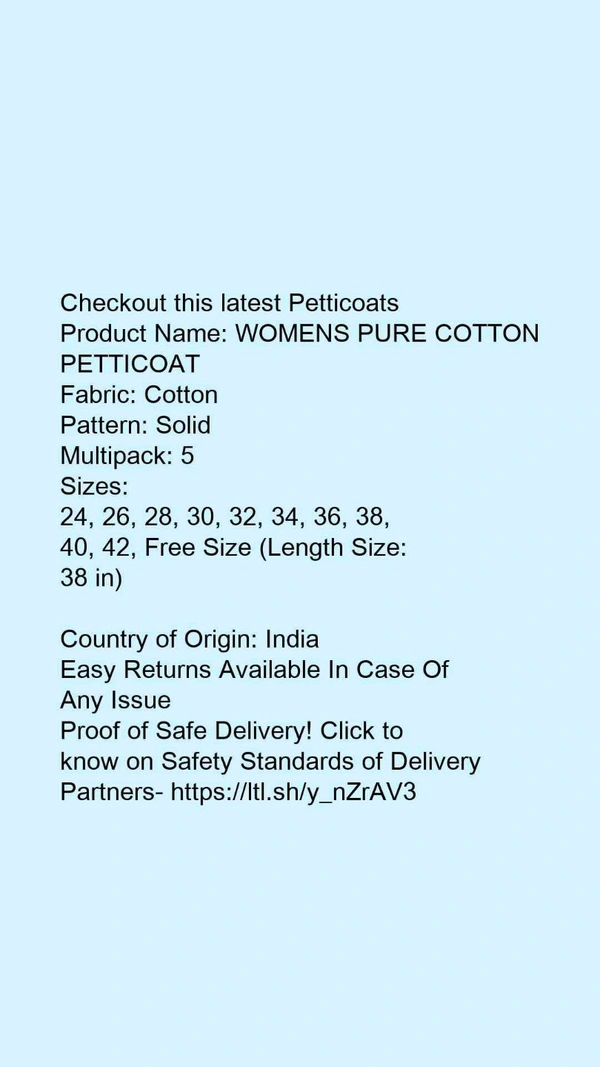 Checkout this latest PetticoatsProduct Name: *WOMENS PURE COTTON PETTICOAT*Fabric: CottonPattern: SolidMultipack: 5Sizes: 24, 26, 28, 30, 32, 34, 36, 38, 40, 42, Free Size (Length Size: 38 in) Country of Origin: India
