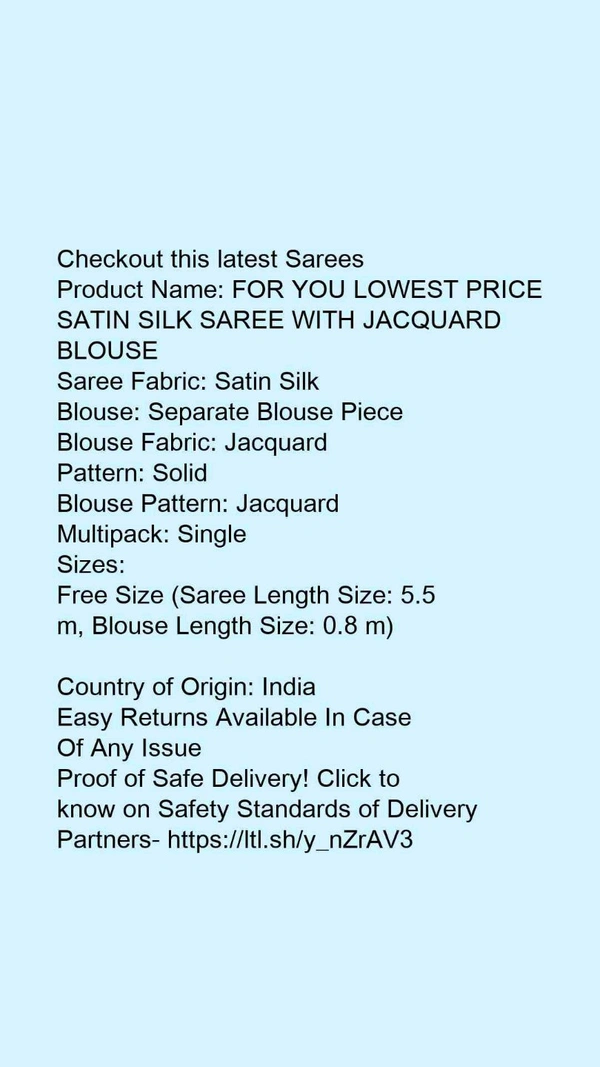 Checkout this latest SareesProduct Name: *FOR YOU LOWEST PRICE SATIN SILK SAREE WITH JACQUARD BLOUSE*Saree Fabric: Satin SilkBlouse: Separate Blouse PieceBlouse Fabric: JacquardPattern: SolidBlouse Pattern: JacquardMultipack: Single