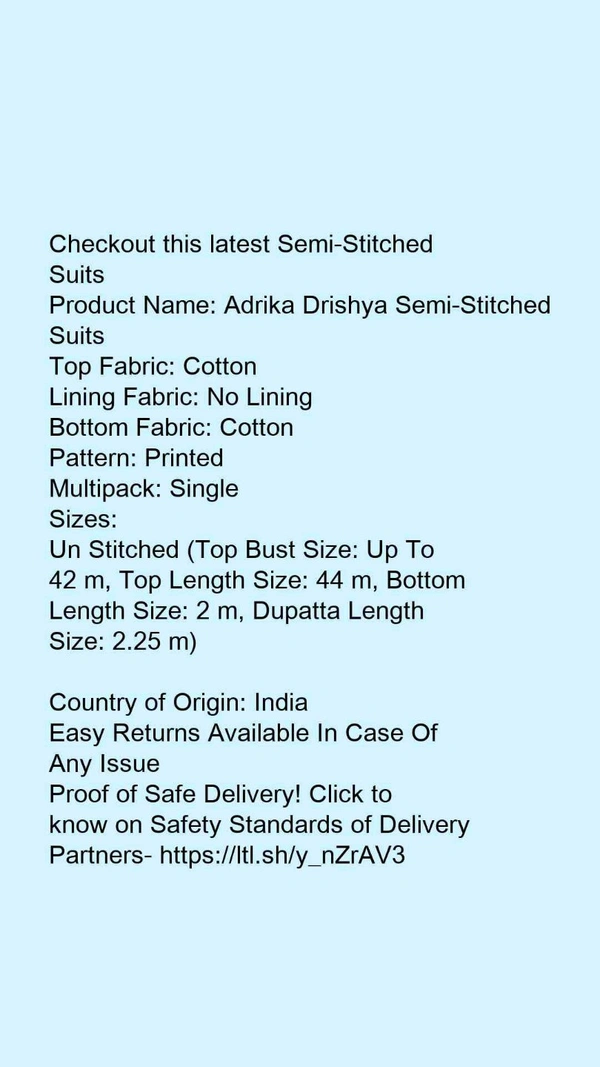 Checkout this latest Semi-Stitched SuitsProduct Name: *Adrika Drishya Semi-Stitched Suits*Top Fabric: CottonLining Fabric: No LiningBottom Fabric: CottonPattern: PrintedMultipack: SingleSizes: Un Stitched (Top Bust Size: Up To 42 m, Top Length Size: 44 m, Bottom Length Size: 2 m, Dupatta Length Size: 2.25 m) Country of Origin: India