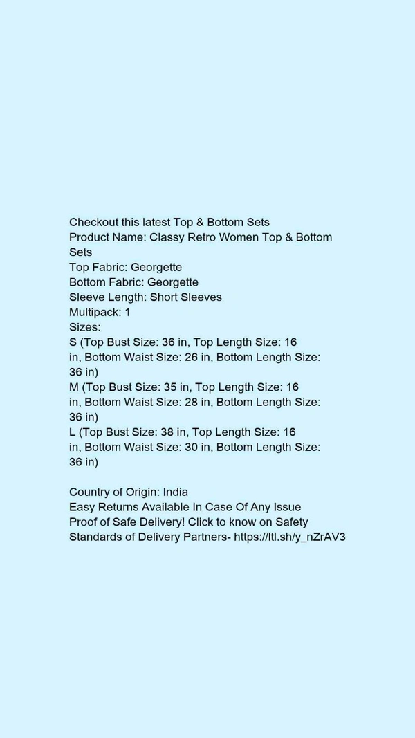 Checkout this latest Top & Bottom SetsProduct Name: *Classy Retro Women Top & Bottom Sets*Top Fabric: GeorgetteBottom Fabric: GeorgetteSleeve Length: Short SleevesMultipack: 1