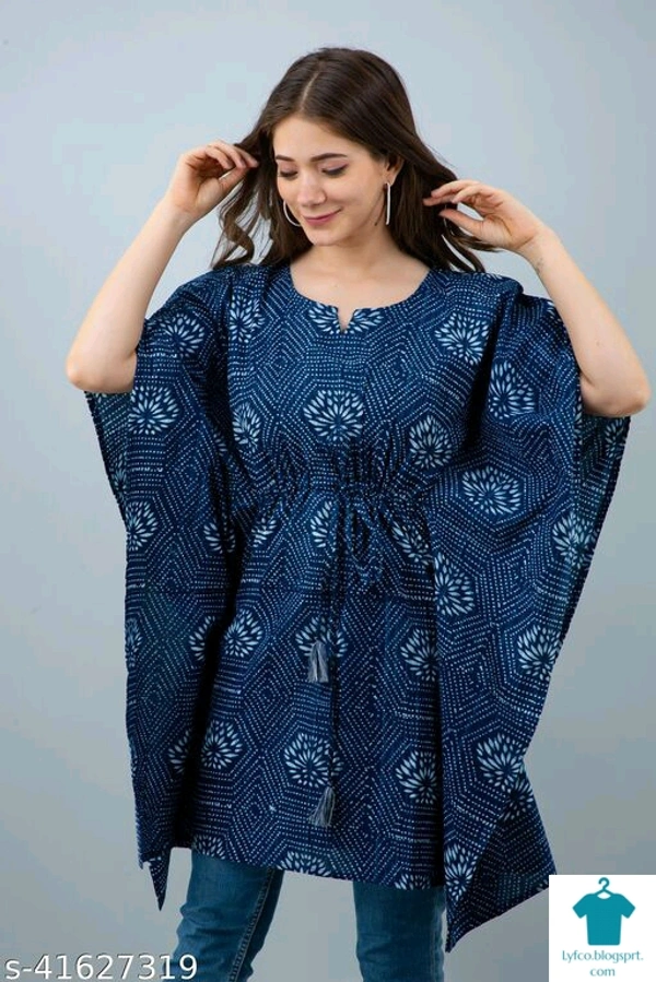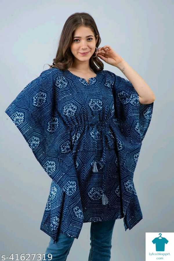 Checkout this latest Tops & TunicsProduct Name: *Charvy Comfy Indigo Printed Cotton Kaftan*Fabric: CottonSleeve Length: Three-Quarter SleevesPattern: PrintedMultipack: 1