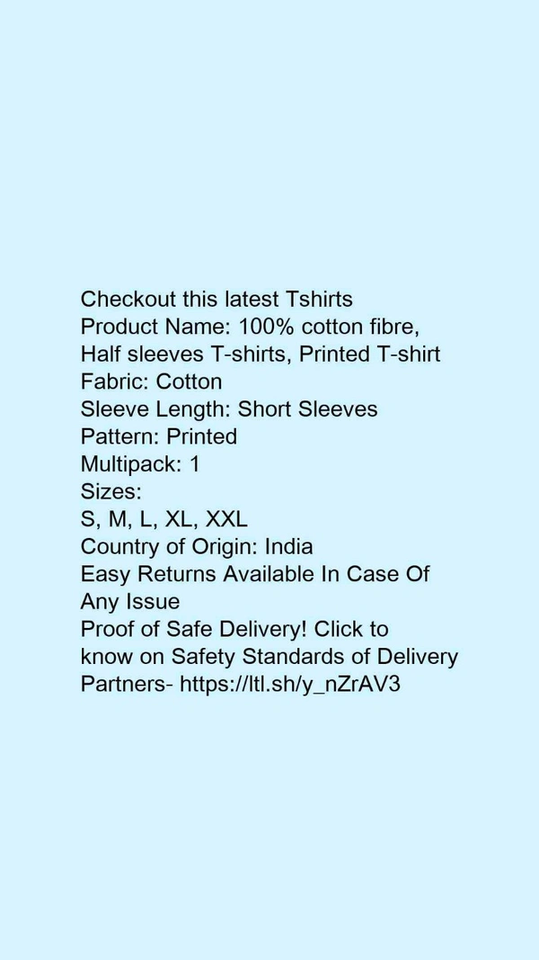 Checkout this latest TshirtsProduct Name: *100% cotton fibre, Half sleeves T-shirts, Printed T-shirt*Fabric: CottonSleeve Length: Short SleevesPattern: PrintedMultipack: 1