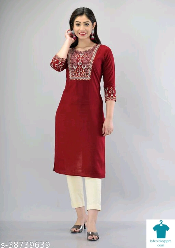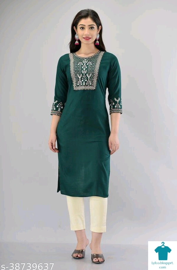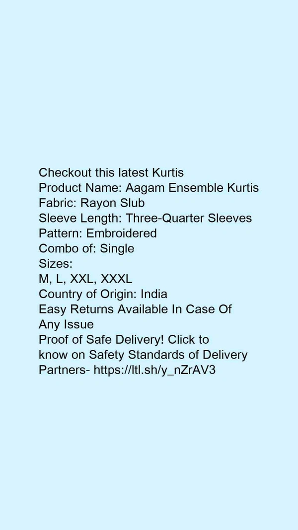 Product Name: *Aagam Ensemble Kurtis*Fabric: Rayon SlubSleeve Length: Three-Quarter SleevesPattern: EmbroideredCombo of: Single